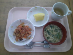 ご飯、豆腐とオクラのスープ、味噌焼き肉、大根のゆかり和え、オレンジ