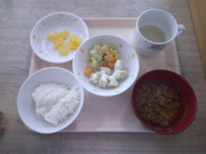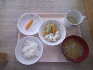 後期食・・・硬粥、野菜スープ、チーズソースハンバーグ、ブロッコリーサラダ