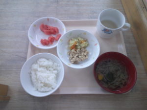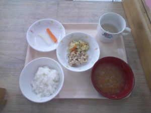 後期食・・・硬粥、野菜スープ、鶏の照り焼き、キャベツ和え