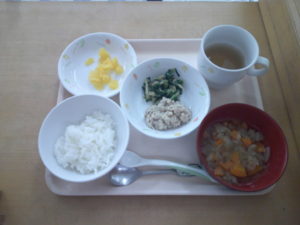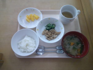 完了食・・・軟飯、野菜スープ、豚肉のみそ焼き、ほうれん草のきのこ和え、オレンジ