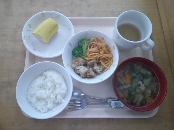 ご飯、八宝菜風スープ、塩唐揚げ、ナポリタン、茹でブロッコリー、バナナ