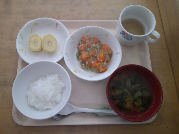 完了食・・・軟飯、小松菜のスープ、鶏肉と野菜の煮物、バナナ