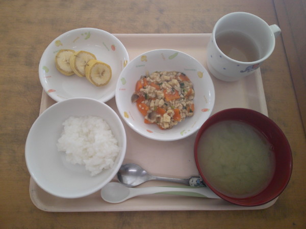 完了食・・・軟飯、もやしの味噌汁、豚肉と高野豆腐の煮物、バナナ