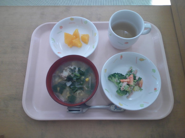 味噌ラーメン、ブロッコリーサラダ、オレンジ、麦茶
