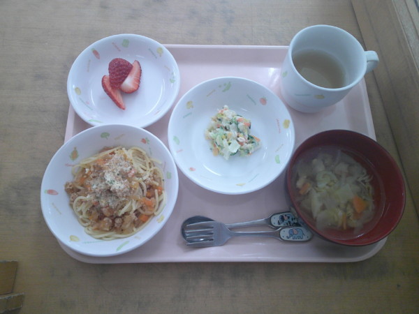 ミートソーススパゲティ、えのきのチキンスープ、白菜のツナ和え、いちご