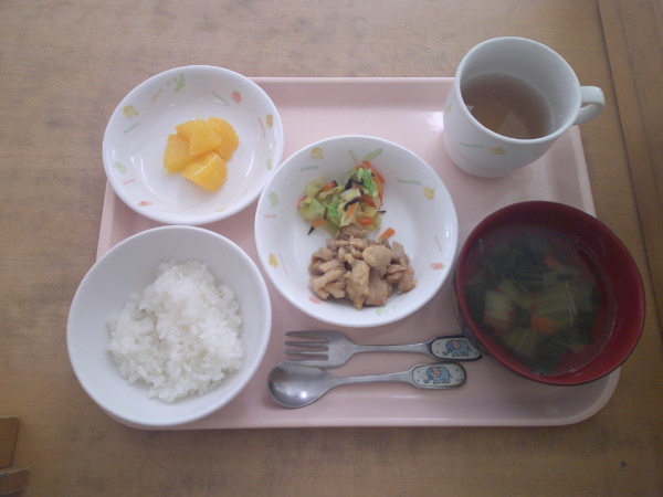 ご飯、チンゲン菜のすまし汁、鶏肉のきじ焼き、キャベツの塩こんぶ和え、オレンジ