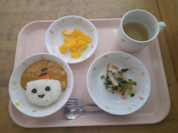 ご飯、節分カレー、小松菜ともやしの中華和え、オレンジ