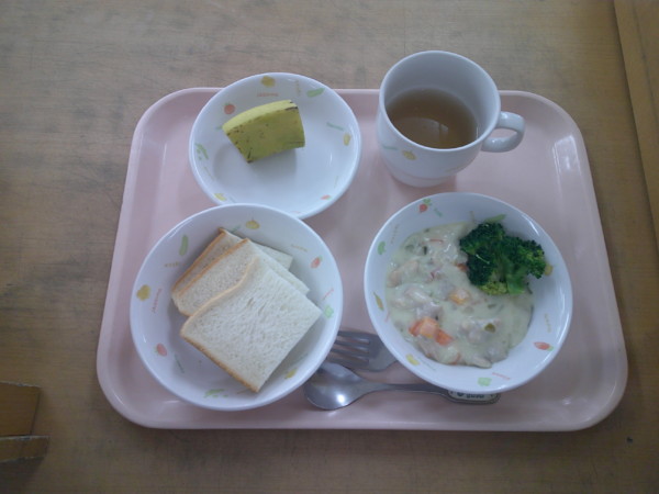 食パン、鶏肉のクリーム煮、茹でブロッコリー、バナナ
