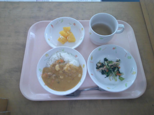ご飯、キーマカレー、小松菜ともやしの中華和え、オレンジ