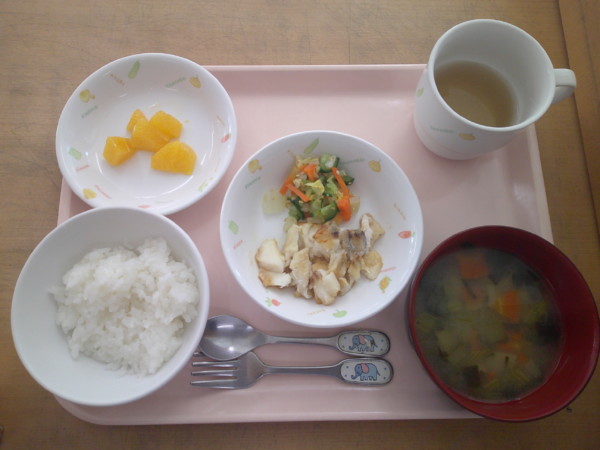 ご飯、さつまいもの味噌汁、たらの和風ステーキ、白菜の浅漬け、オレンジ