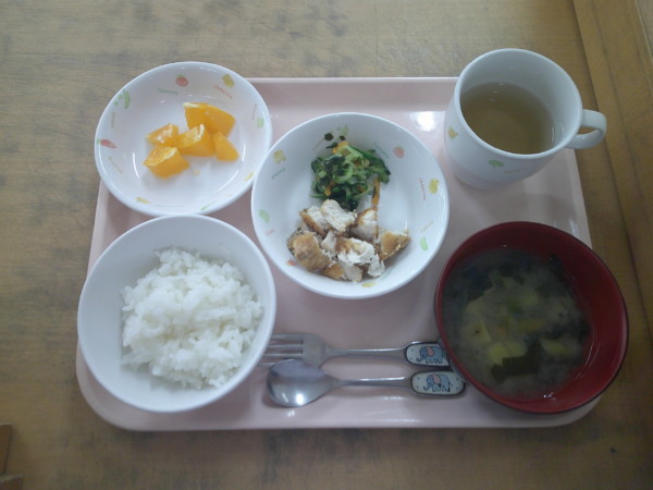 ご飯、さつまいもの味噌汁、さわらの竜田揚げ、きゅうりの酢の物、オレンジ
