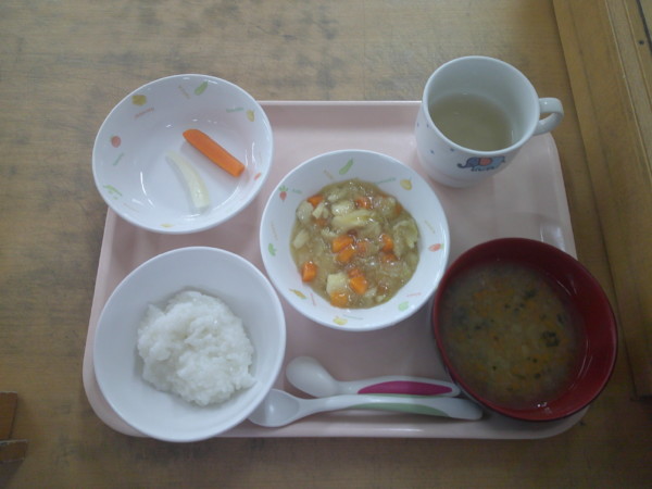 中期食 お粥、さつまいもの味噌汁、たらと野菜の煮物